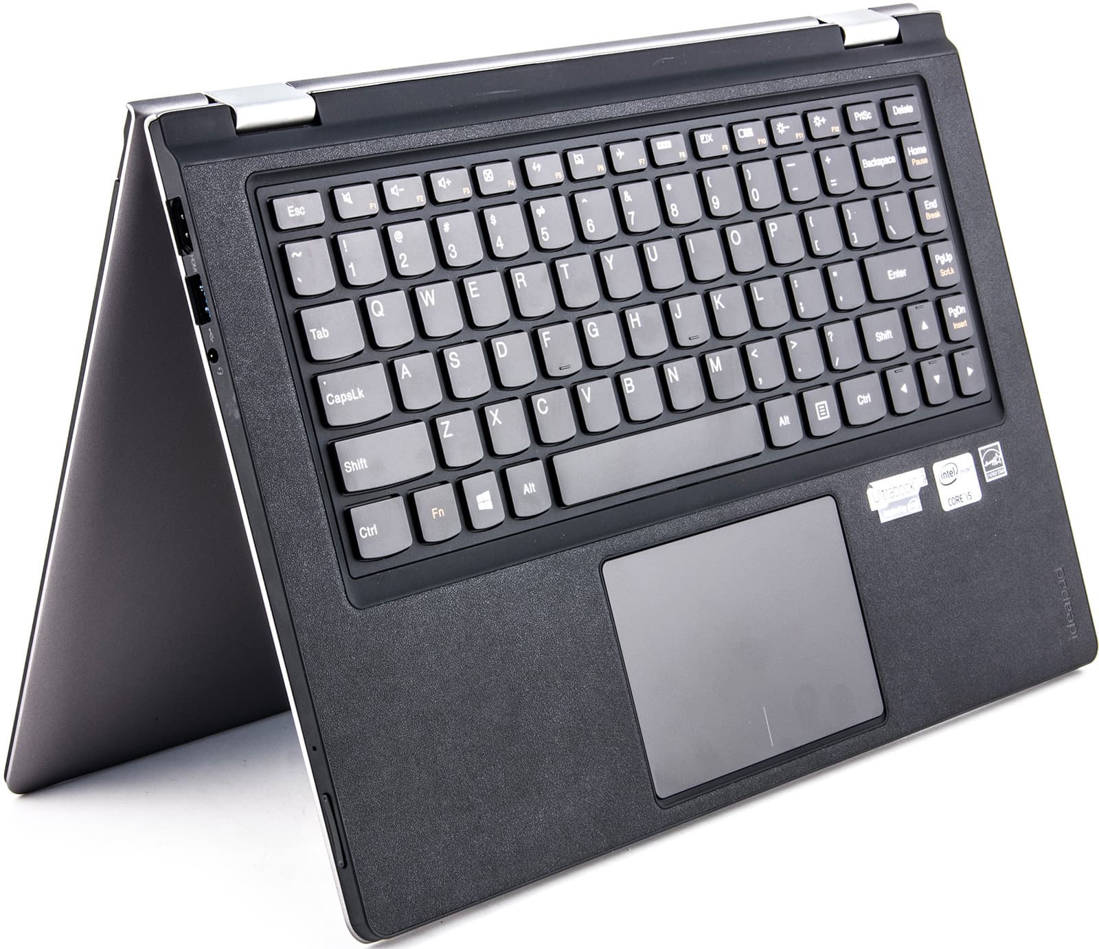 А вот вариант «шалашиком» вполне имеет право на существование — в некоторых ситуациях он весьма удобен. Можно поставить Yoga 13 на стол и работать с ним как с обычным планшетом (в этом положении он весьма устойчив), очень удобно посмотреть кино. Плюс, он занимает совсем немного места, т. е. вполне встанет, например, на откидном столике в самолете. Кстати, петли в этом случае стоят неровно и корпус будет всегда стоять более вертикально, чем экран. Но ничего страшного в этом нет.