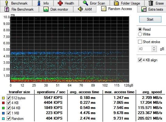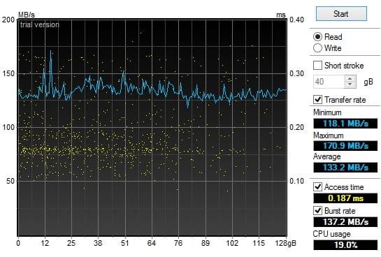 В HDTune результаты как обычно ниже и в общем выглядят уже довольно грустно. Причем речь идет не только о низкой скорости чтения. Смущает также ломаный график чтения (обычно у SSD он представляет собой ровную линию, за редкими исключениями) и очень маленький результат Burst Rate, т. е. чтение из буфера. Также эта тестовая утилита демонстрирует довольно высокое время доступа и очень большой разброс этого параметра (желтые точки обычно выстраиваются вдоль определенного уровня). Мне кажется, что проблема либо с ПО, либо с прошивкой SSD.