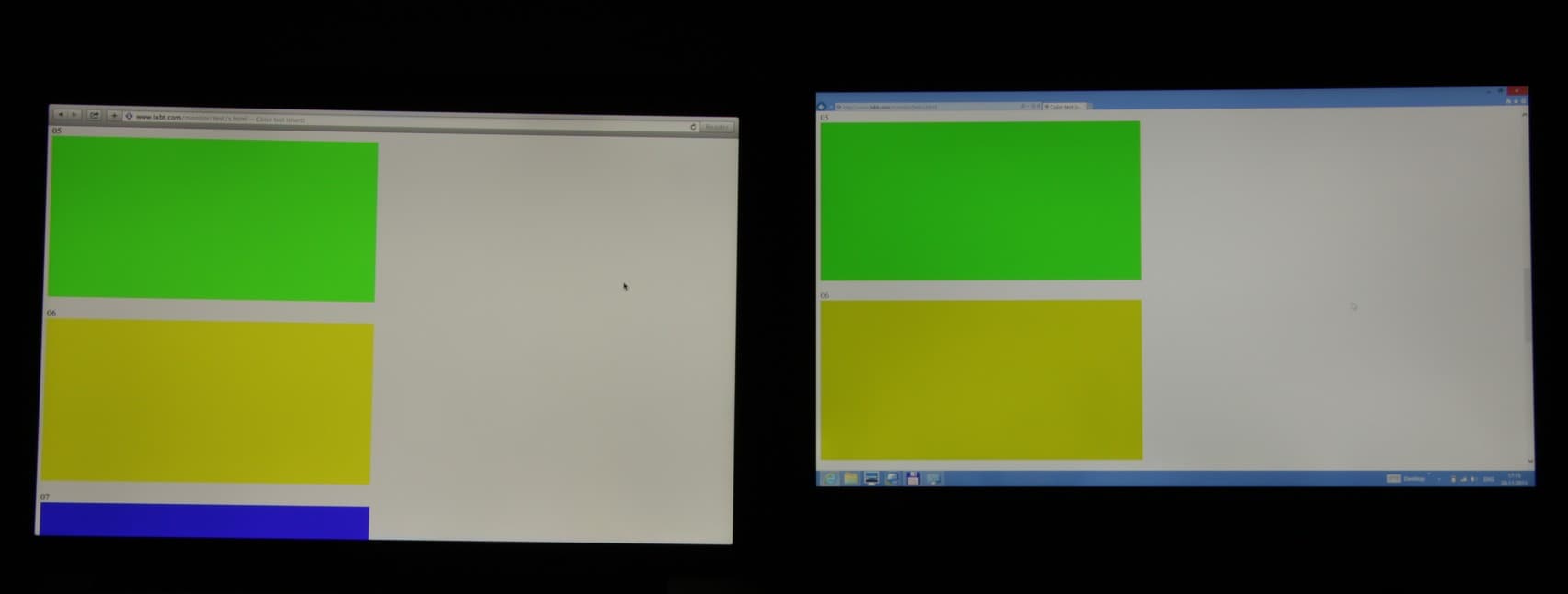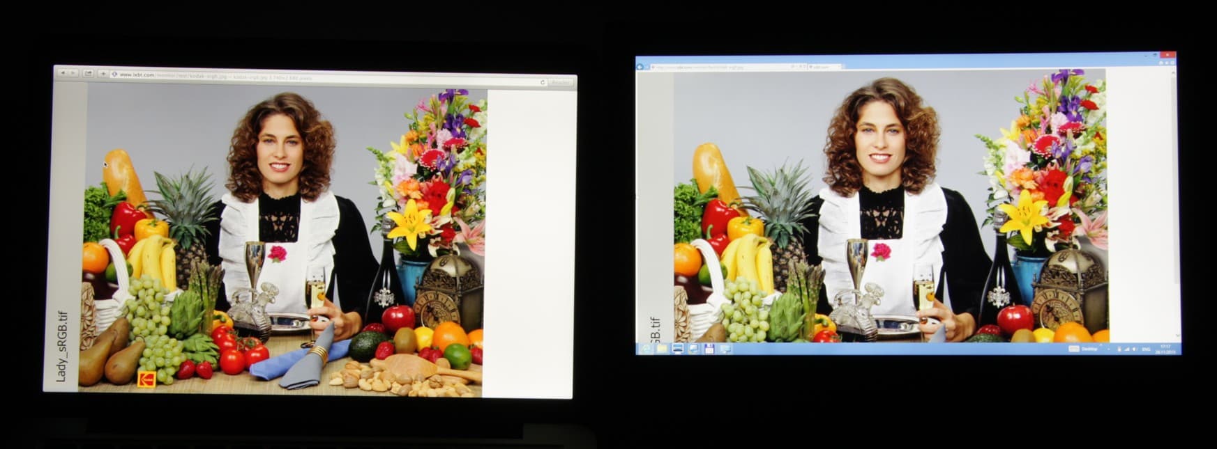 Если смотреть не на фотографии, а глазами, разница между желтым прямоугольником на экранах замета еще больше. Но, например, при выводе цветного изображения во весь экран с цветами все более-менее в порядке: