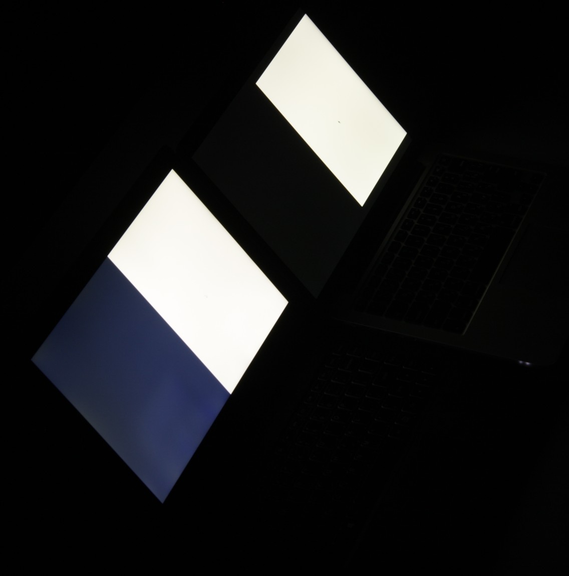 Экран Lenovo Yoga 2 Pro имеет хорошие углы обзора без инвертирования оттенков и без значительного сдвига цветов даже при больших отклонениях взгляда от перпендикуляра к экрану. Однако черное поле при отклонении по диагонали сильно высветляется и приобретает фиолетовый оттенок. Сравним с экраном MacBook Pro при отклонении примерно на 45 градусов от плоскости и стороны экрана (яркость белых участков в перпендикулярном направлении у обоих экранов примерно одинаковая; Lenovo Yoga 2 Pro — слева внизу):