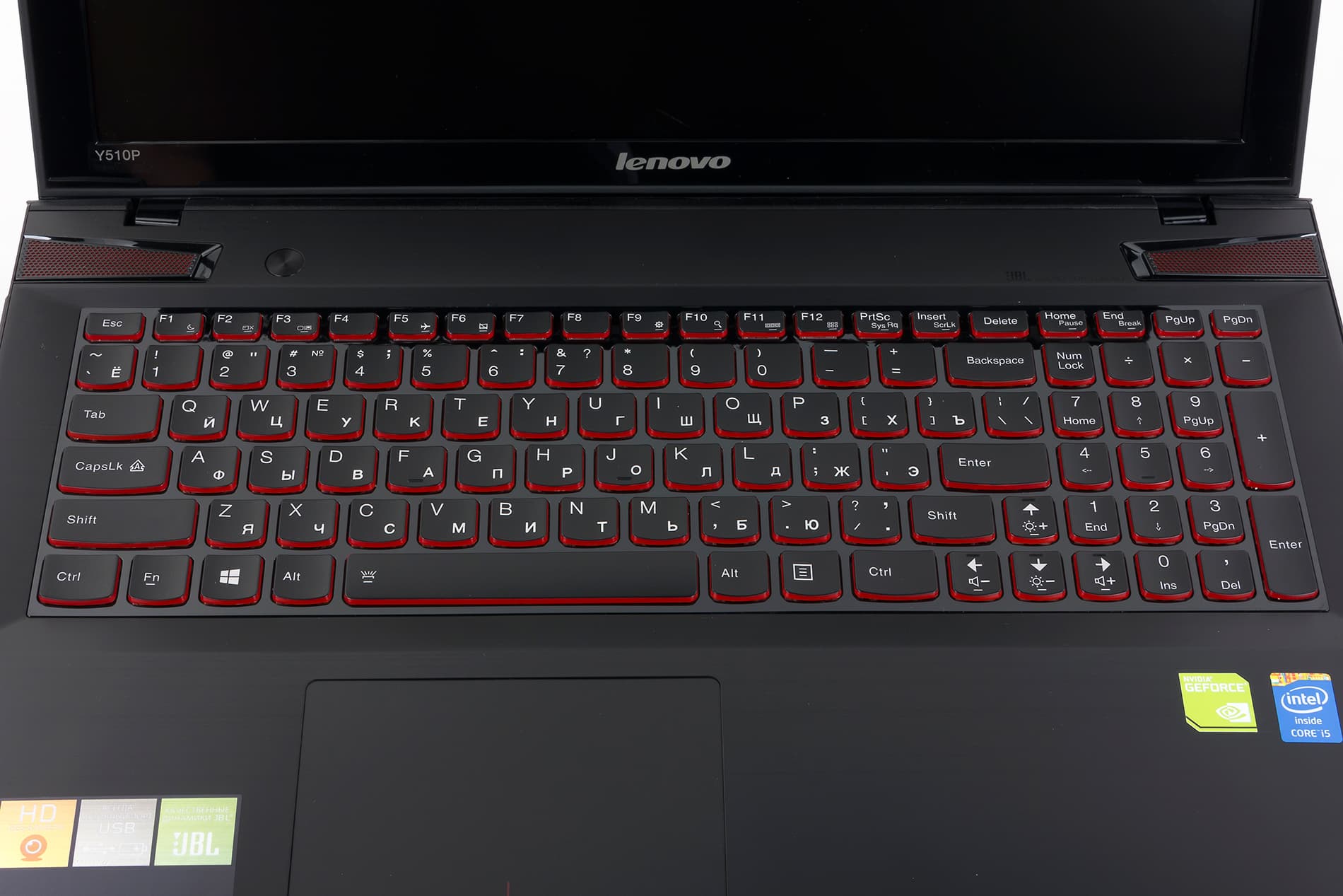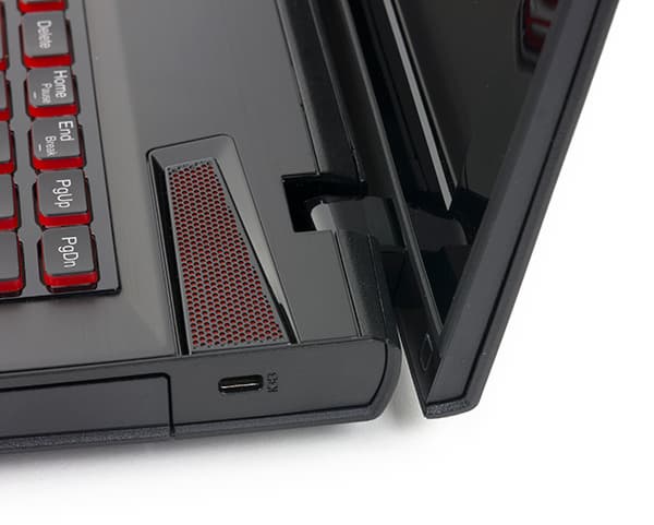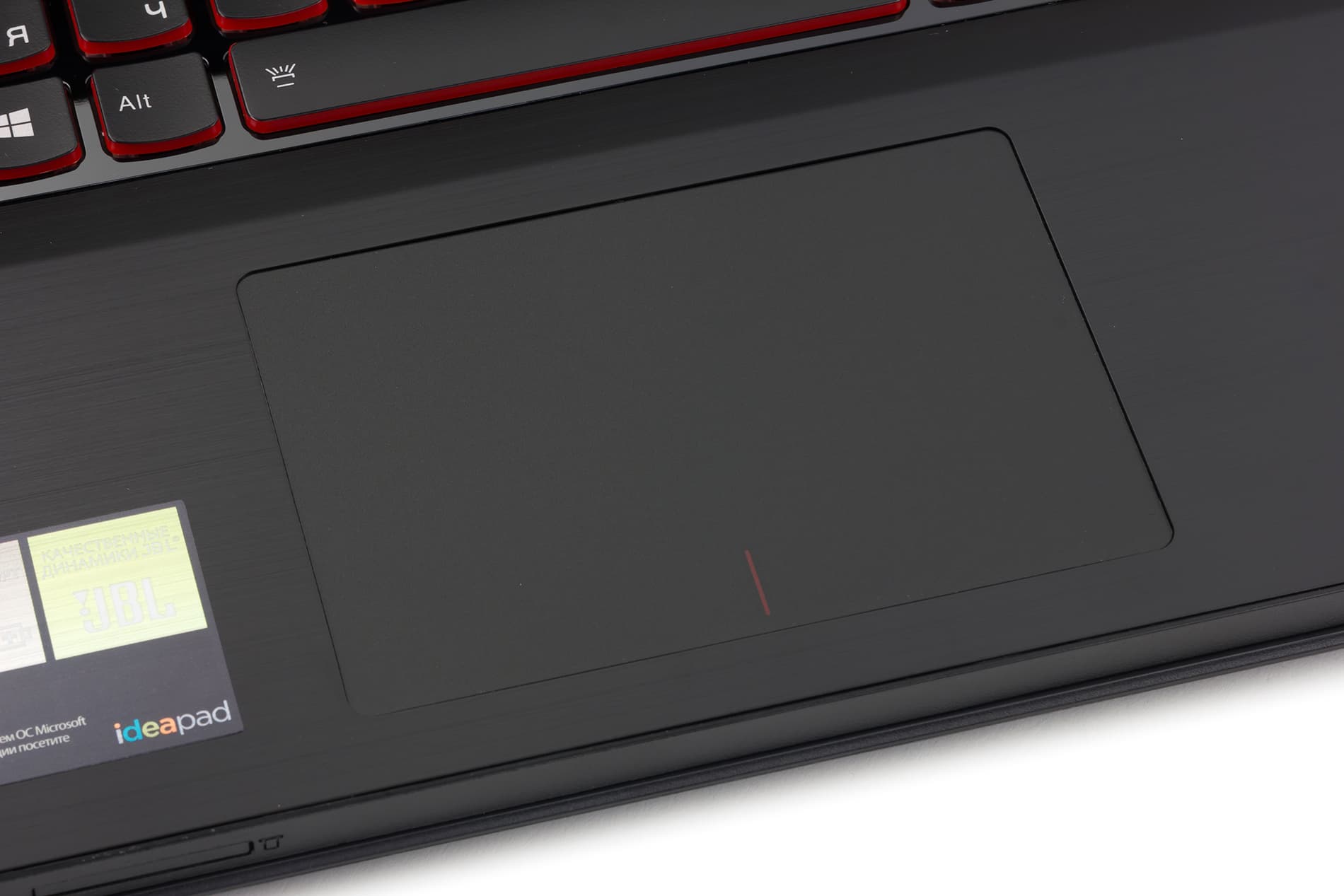 Клавиши на клавиатуре в этом ноутбуке черные, но с боков по периметру они красного цвета. Подробно о клавиатуре и о тачпаде мы расскажем чуть позже.