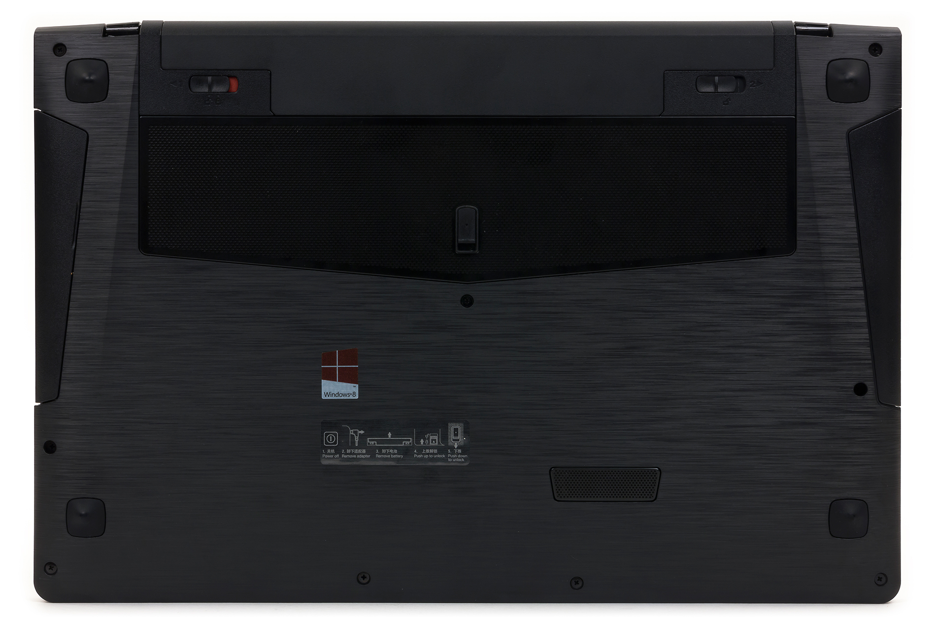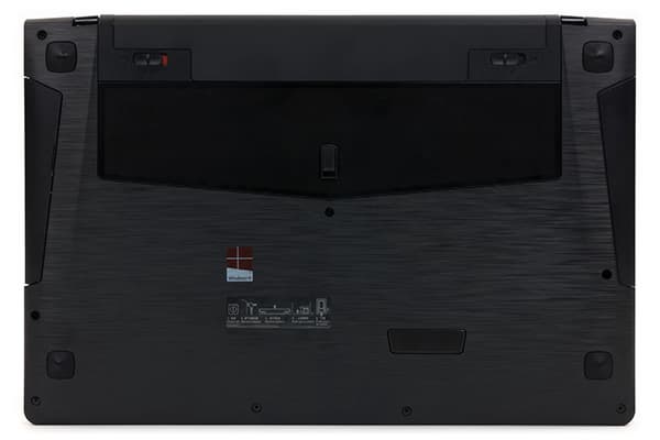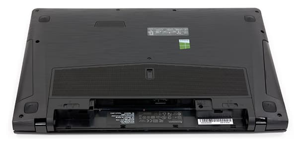Нижняя панель корпуса ноутбука выполнена из черного пластика с имитацией под шлифованный металл. На нижней панели расположены четыре высокие резиновые ножки, которые не дают скользить ноутбуку по столу. Кроме того, здесь же имеется и металлическая вентиляционная сетка, сквозь которую в систему охлаждения засасывается воздух.