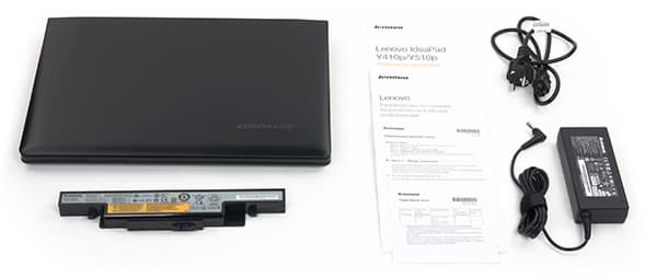 Lenovo IdeaPad Y510P поставляется во внешне непритязательной картонной коробке с ручкой. Кроме самого ноутбука, в комплект поставки входит лишь адаптер питания, гарантийный талон и краткое руководство пользователя, то есть комплект поставки минимален.