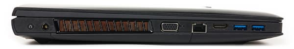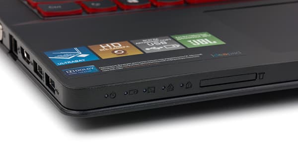 На левом торце корпуса ноутбука расположены два порта USB 3.0, видеовыходы HDMI и VGA (D-Sub), сетевой разъем RJ-45 и разъем питания. Кроме того, рядом с разъемом питания находится маленькая кнопка Nova. Когда ноутбук выключен или находится в режиме сна, нажатие на эту кнопку приводит в запуску встроенной утилиты, позволяющей начать процесс восстановления системы (Lenovo OneKey Recovery), войти в меню загрузки или в режим настройки BIOS.