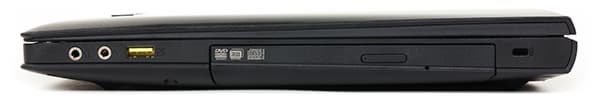 На правом торце имеется порт USB 2.0, два аудиоразъема типа миниджек, отсек Ultrabay и отверстие под кенсингтонский замок.