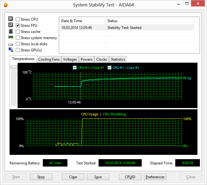 При загрузке процессора тестом Stress CPU (утилитой AIDA64 Extreme Edition — тест на стабильность системы), который использует целочисленные вычисления, частота процессора составляет 3,0 ГГц. (напомним, что максимальная частота Intel Core i5-4200M в режиме Intel Turbo Boost составляет 3,1 ГГц). Температура процессора в этом режиме загрузки увеличивается до 64-65 °C.