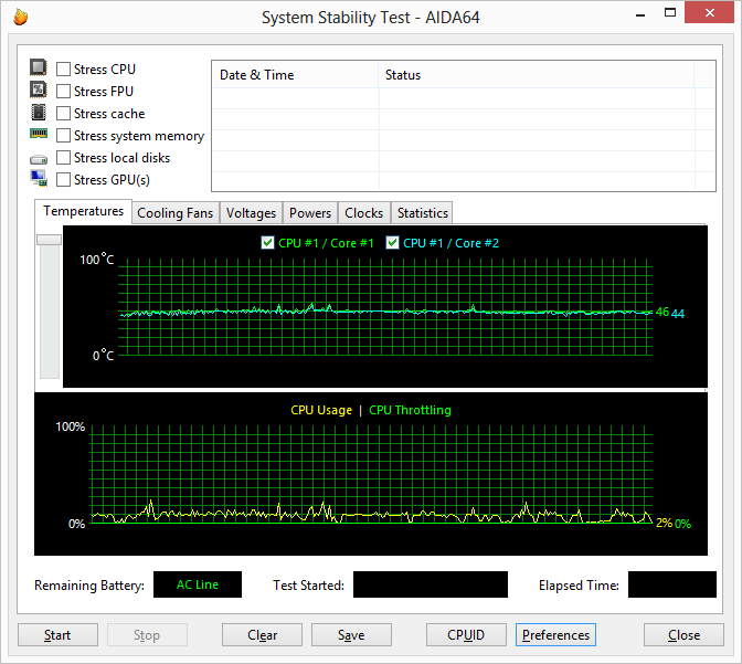 В режиме простоя, как и должно быть, частота процессора в ноутбуке составляет 800 МГц (естественно, речь идет о сбалансированной схеме энергопотребления), то есть к технологии Intel SpeedStep никаких претензий нет. Температура процессора в этом режиме составляет 44-46 °C.
