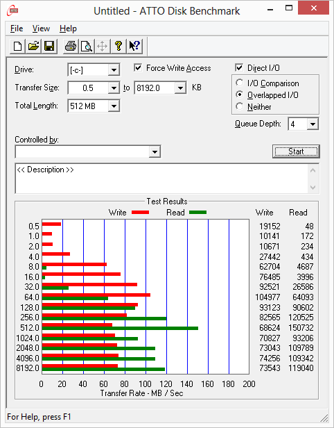 Утилита ATTO Disk Benchmark определяет максимальную скорость последовательного чтения на уровне почти 150 МБ/с. Однако такая скорость достигается лишь при размере блока в 512 КБ, а при размере блока менее 32 КБ скорость последовательного чтения очень низкая. Скорость последовательной записи при малых размерах блока существенно выше, чем скорость чтения, но максимальная скорость записи составляет чуть более 100 МБ/с (для блоков размером 64 КБ). Одним словом, результаты тестирования подсистемы хранения данных довольно плачевные, особенно если их сопоставлять с показателями SSD-накопителя.