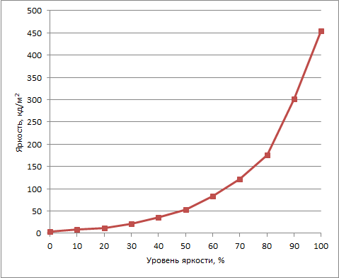 Отметим, что в данном ноутбуке яркость экрана меняется нелинейно в зависимости от уставливаемого уровеня яркости. График этой зависимости приводится ниже: