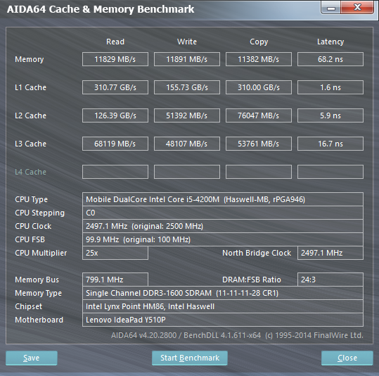 Согласно данным утилиты AIDA64 Cache & Memory Benchmark, скорость записи данных в память составляет 11891 МБ/с, а скорость чтения — 11829 МБ/с. Для памяти DDR3-1600 (пиковая пропускная способность 12800 МБ/с) в одноканальном режиме работы это вполне типичные показатели.