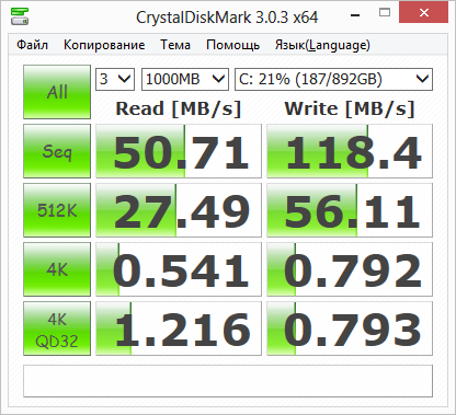 Результаты теста CrystalDiskMark также демонстрируют достаточно низкий уровень производительности установленного в ноутбуке HDD-диска.