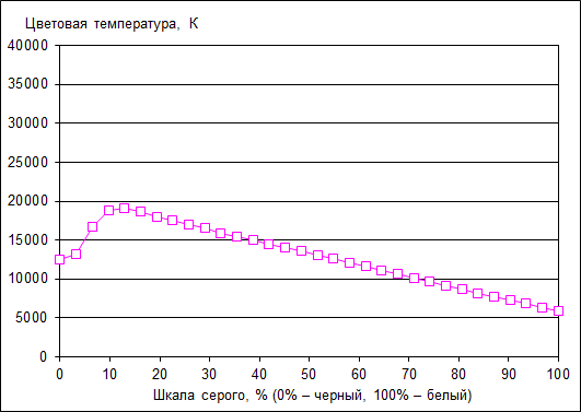 Цветовая температура ЖК-экрана ноутбука Lenovo IdeaPad Y510P нестабильна по всей шкале серого. При 100% белого цветовая температура составляет 5900 К, но при переходе к более темным тонам она начинает возрастать, достигая значения в 20000 К при 10% белого.