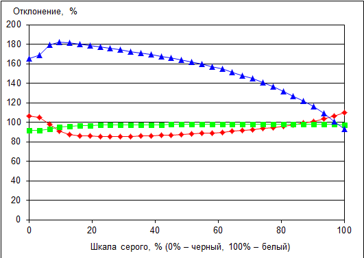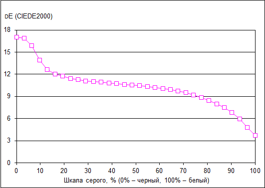 Что касается точности цветопередачи (дельта Е), то ее значение не превосходит 12 (темную область можно не учитывать), что является допустимым результатом для данного класса экранов.