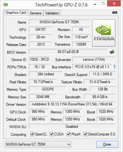 Имеется в этом ноутбуке и дискретная видеокарта Nvidia GeForce GT 755M с 2 ГБ памяти GDDR5. Судя по информации на сайте производителя, в ноутбуки Lenovo IdeaPad Y510P устанавливается видеокарта Nvidia GeForce GT 750M, и действительно, в продаже есть варианты этого ноутбука именно с GeForce GT 750M.