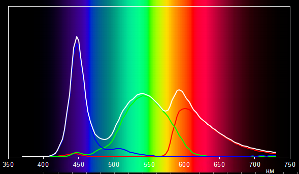 Светофильтры ЖК-матрицы немного подмешивают компоненты друг к другу. Так, в спектр красного цвета подмешивается зеленый цвет, в результате пик спектра красного цвета немного смещается в сторону желтого цвета. В принципе, такая ситуация вполне типична для ЖК-матриц, используемых в ноутбуках.