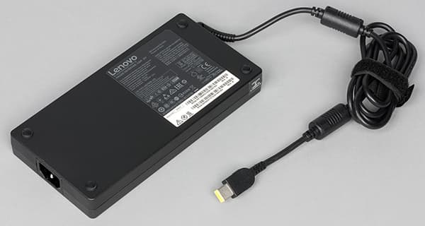 Адаптер питания имеет мощность 230 Вт и нестандартное, но типичное для ноутбуков Lenovo, выходное напряжение 20 В. Штекер питания также фирменный. Он имеет прямоугольную форму (опять-таки, это типично для ноутбуков Lenovo, но не встречается в ноутбуках других производителей).