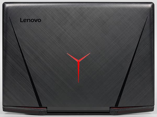 Корпус ноутбука выполнен их алюминия и пластика. Крышка имеет вставку из тонкого листа алюминия, отделанного под шлифованный металл черного цвета. На крышке красуется подсвечиваемый логотип игровых устройств Lenovo.