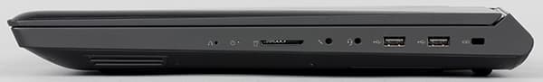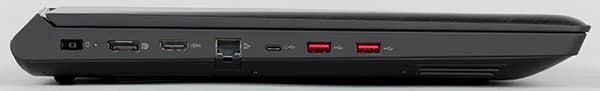 На левом торце корпуса ноутбука расположены два порта USB 3.0 (они маркируются красным цветом), порт USB 3.1 (Type-C), разъемы HDMI и DisplayPort, сетевой разъем RJ-45 и разъем питания.