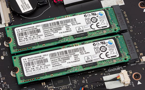 Подсистема хранения данных ноутбука Lenovo IdeaPad Y900-17ISK может быть различной. Это может быть комбинация одного SSD и одного HDD, либо двух SSD, объединенных в RAID-массив уровня 0 и одного HDD.
