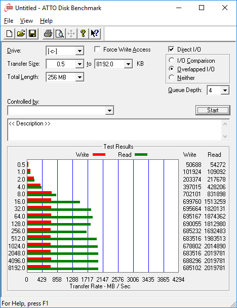 Утилита ATTO Disk Benchmark определяет максимальную скорость последовательного чтения SSD-накопителя на уровне 2020 МБ/с, а скорость последовательной записи — на уровне 685 МБ/с. Для одиночного накопителя это хороший результат.