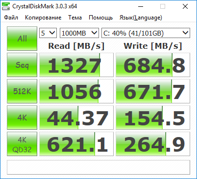 Как видим, результат по скорости последовательного чтения, демонстрируемый утилитой CrystalDiskMark, несколько ниже — только 1327 МБ/с. Разница в показаниях CrystalDiskMark и ATTO Disk Benchmark объясняется тем, что в утилите ATTO Disk Benchmark используется глубина очереди задач, равная 4, а в утилите CrystalDiskMark — равная 1.