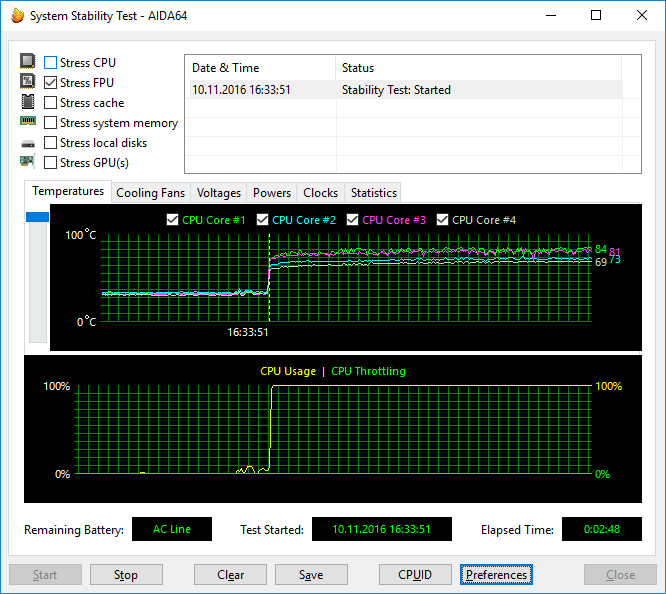 В варианте загрузки Stress FPU частота процессора составляет 3,0 ГГц, а температура ядер увеличивается до 84 °С. Мощность энергопотребления процессора порядка 61 Вт.