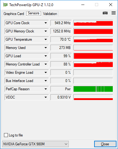Как выяснилось в ходе тестирования, в ноутбуке Lenovo IdeaPad Y900-17ISK в режиме стрессовой загрузки видеокарты (FurMark 1.18.2.0) в установившемся режиме частота GPU составляет 680-720 МГц. Частота памяти GDDR5 составляет 1252,8 МГц.