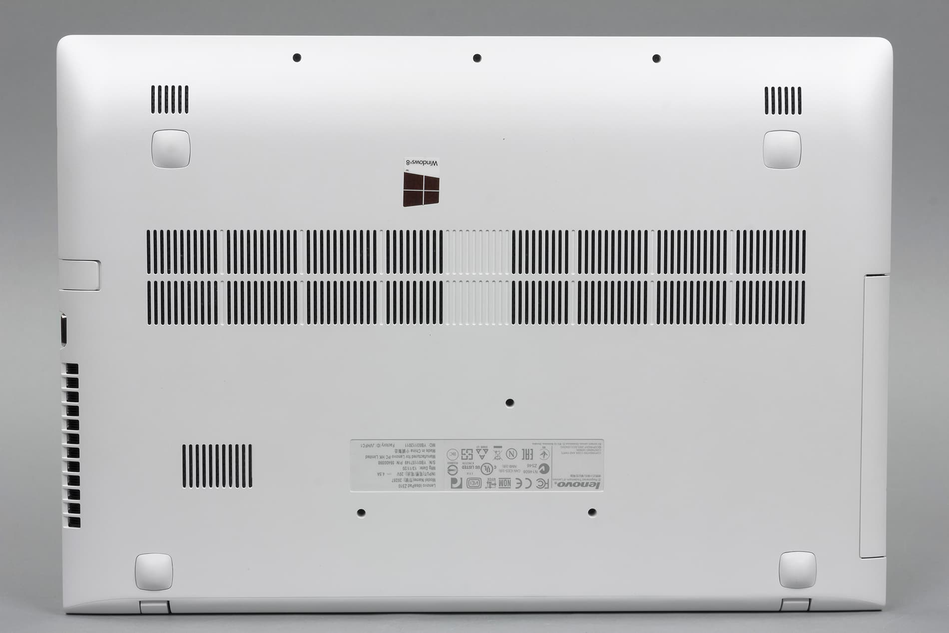 На нижней панели расположены четыре резиновые ножки, которые не дают скользить ноутбуку по столу. Кроме того, здесь же имеется и несколько металлических вентиляционных решеток.