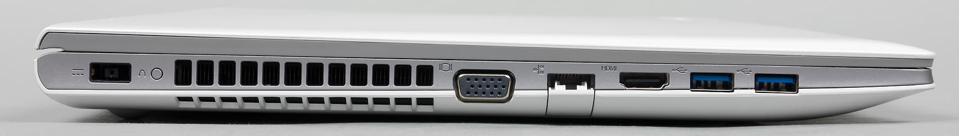 На левом торце корпуса расположены два порта USB 3.0, разъем HDMI, разъем VGA, сетевой разъем RJ-45 и разъем питания. Отметим, что поскольку корпус ноутбука достаточно тонкий, сетевой разъем RJ-45 сделан с откидной крышкой. Разъем питания в этом ноутбуке имеет прямоугольную форму (такой разъем используется во многих ноутбуках Lenovo), так что воспользоваться универсальным адаптером питания в данном случае не получится. Кроме того, рядом с разъемом питания имеется маленькая кнопка Nova. Когда ноутбук выключен или находится в режиме сна, нажатие на эту кнопку приводит в запуску встроенной утилиты, позволяющей запустить процесс восстановления системы (Lenovo OneKey Recovery), войти в меню загрузки или в режим настройки BIOS.