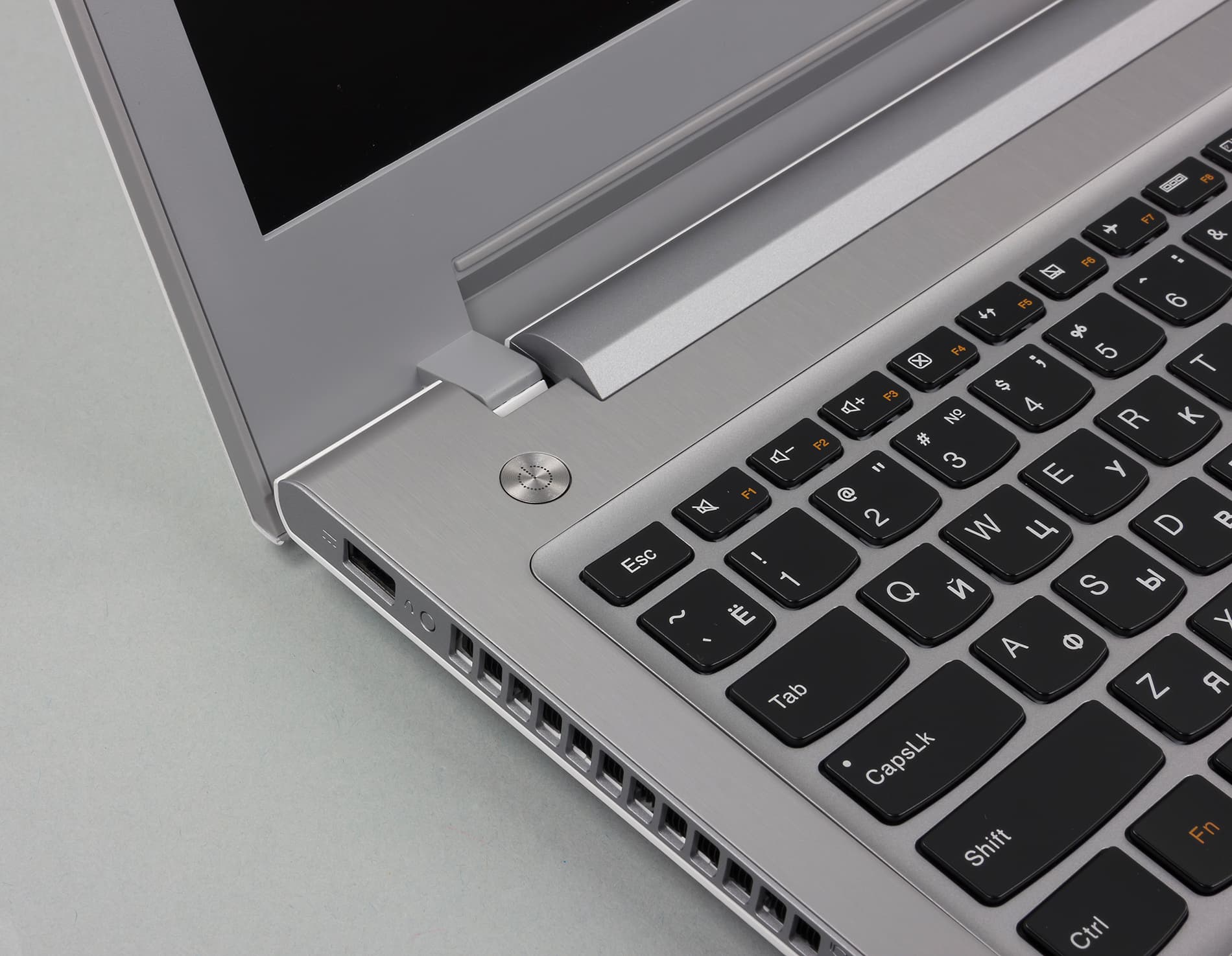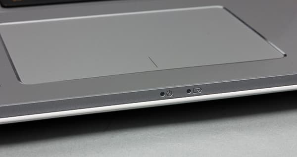 Поверхность, обрамляющая тачпад и клавиатуру, имеет металлизированное покрытие (вот в этом уже можно не сомневаться), отделанное под шлифованный металл светло-серого цвета. Сверху над клавиатурой в левом углу расположена одна единственная кнопка включения ноутбука.