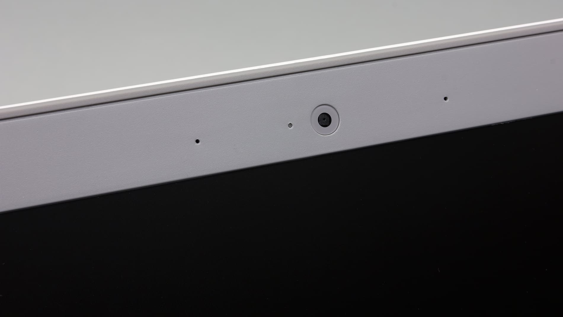 Матовый экран в этом ноутбуке имеет рамку из серого матового пластика. Ширина рамки сверху 23 мм, а с боков — 17 мм. На рамке сверху расположена веб-камера и отверстия двух микрофонов.