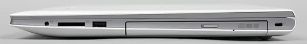 На правом торце имеется порт USB 2.0, комбинированный аудиоразъем типа миниджек, слот картовода, лоток оптического привода и отверстие под кенсингтонский замок.