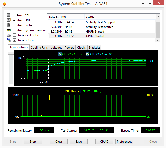 В режиме одновременной загрузки и ядер процессора (Stress FPU), и графического ядра (Stress GPU) частота ядер процессора снижается до 2,5 ГГц, а их температура увеличивается до 89 °С. Однако никакого троттлинга не наблюдается и в данном режиме работы.