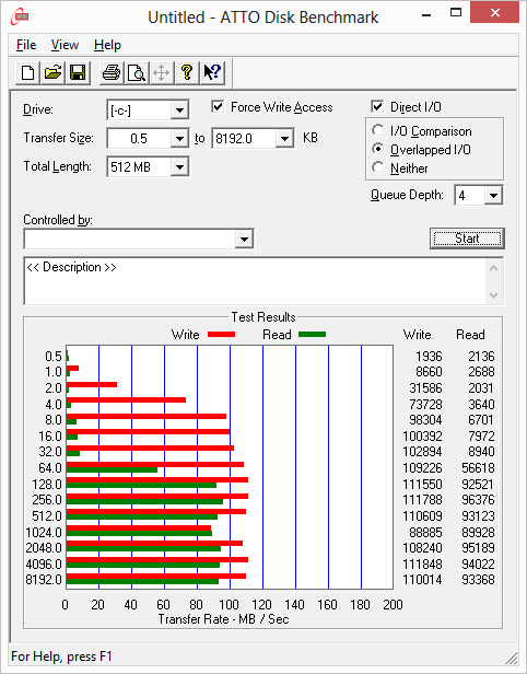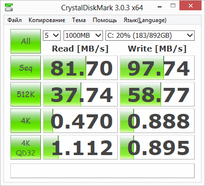 Скорость последовательной записи при малых размерах блока существенно выше, чем скорость чтения, но максимальная скорость записи составляет порядка 110 МБ/с. Если эти результаты сравнить со скоростью чтения и записи для SSD-накопителя, то выглядят они более чем плачевно.