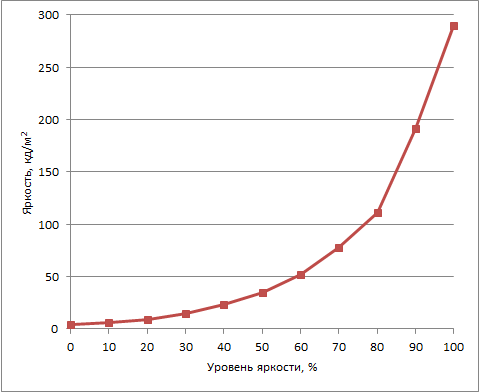 Отметим, что в данном ноутбуке яркость экрана меняется нелинейно в зависимости от устанавливаемого уровня яркости. График зависимости уровня яркости от выставленного значения приводится далее.
