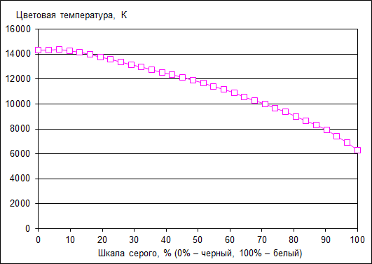 Цветовая температура ЖК-экрана Lenovo IdeaPad Z510 нестабильна по всей шкале серого. При 100% белого цветовая температура составляет 6000 К, но при переходе к более темным тонам она возрастает до 14000 К.