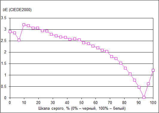 Что касается точности цветопередачи (дельта Е), то ее значение не превосходит 3 (темную область можно не учитывать), что является отличным результатом для данного класса экранов.