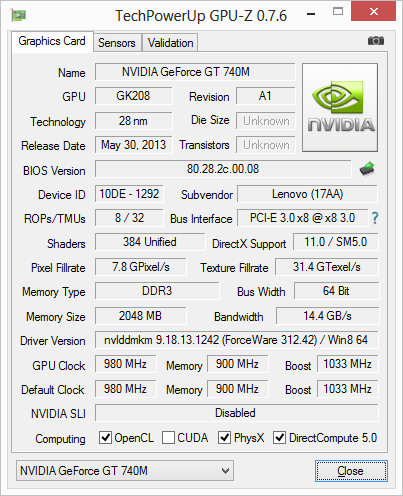 Кроме интегрированного в процессор графического ядра Intel HD Graphics 4600, в ноутбуке Lenovo IdeaPad Z510 также установлена дискретная видеокарта Nvidia GeForce GT 740M c 2 ГБ памяти DDR3. Это бюджетная видеокарта с довольно слабой производительностью. И если для мультимедийного ноутбука наличие такой видеокарты еще можно оправдать, то для игрового ноутбука ее производительности явно недостаточно. Впрочем, о результатах тестирования этого ноутбука в играх мы расскажем чуть позже.