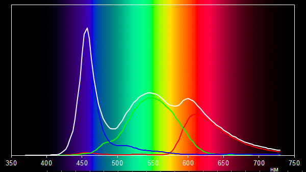 Светофильтры ЖК-матрицы немного подмешивают компоненты друг к другу. Так, в спектр красного цвета подмешивается зеленый цвет, в результате пик спектра красного цвета немного смещается в сторону желтого цвета. Такая ситуация вполне типична для ЖК-матриц, используемых в ноутбуках.
