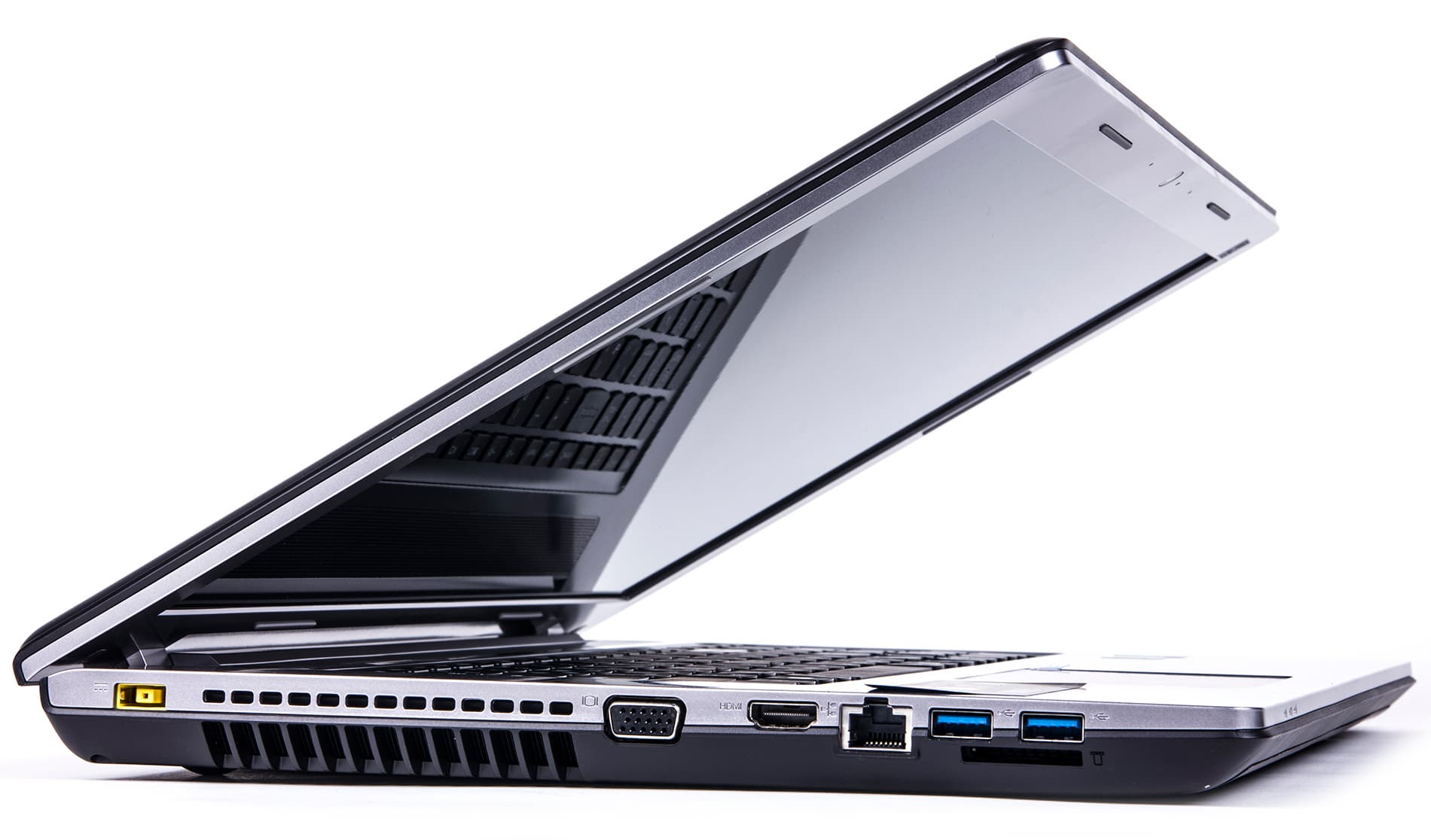 На левом торце корпуса ноутбука расположено два порта USB 3.0, разъем HDMI, разъем VGA, сетевой разъем RJ-45, слот для карт памяти и разъем питания. Отметим, что разъем питания фирменный (он плоский и похож на разъем USB) и воспользоваться универсальным адаптером питания в данном случае вряд ли удастся (такие насадки в универсальных адаптерах питания не встречаются).