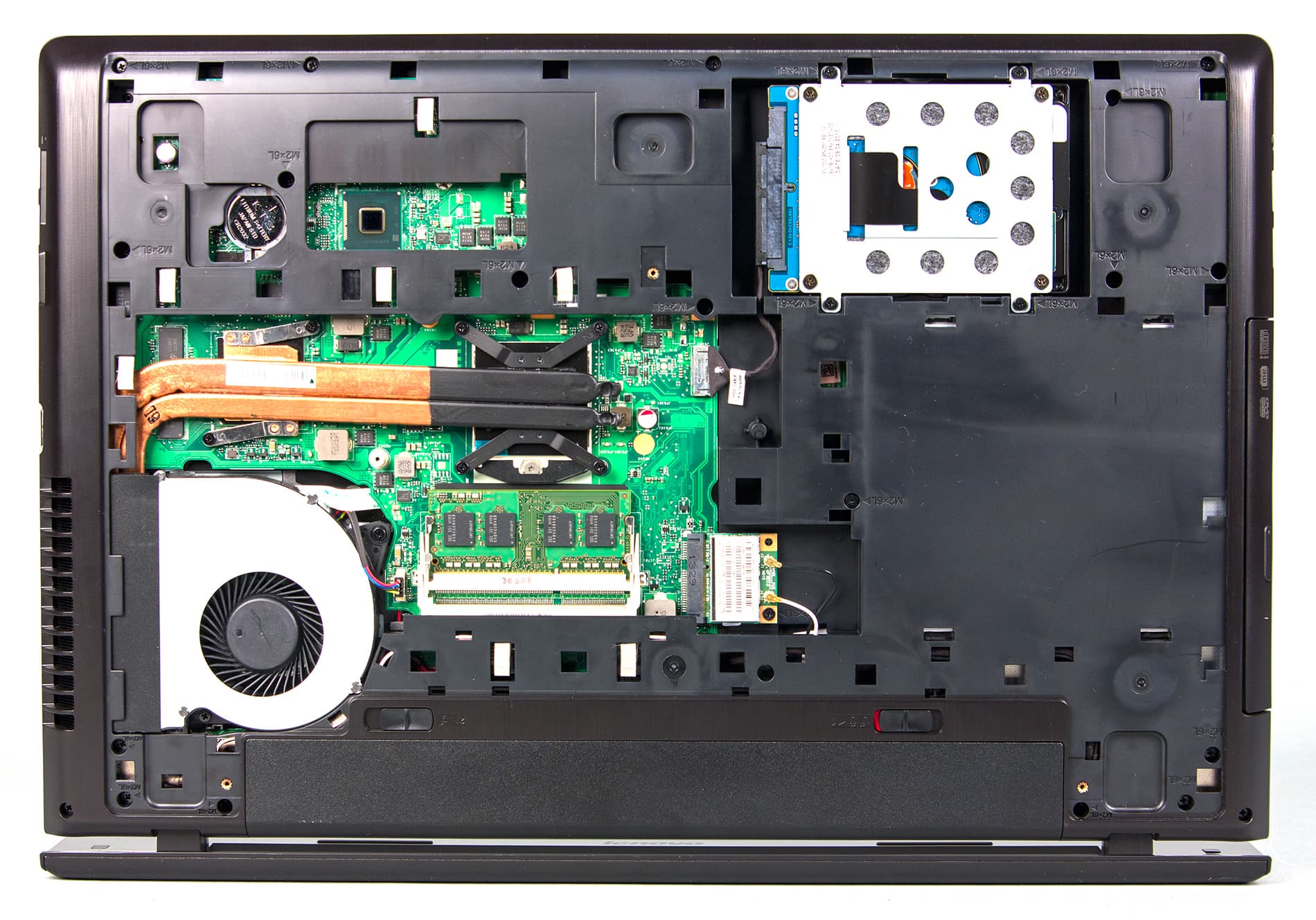 После снятия нижней панели корпуса можно получить доступ к HDD-диску, модулям памяти, модулю Wi-Fi и системе охлаждения.