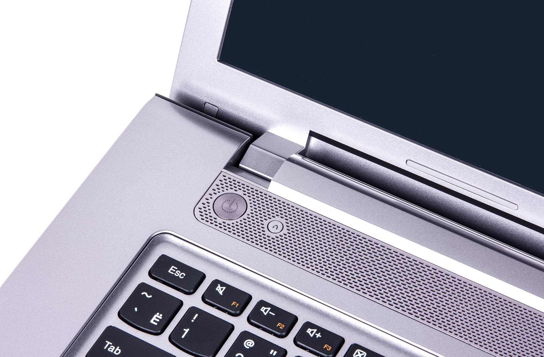 Над клавиатурой ноутбука расположена декоративная металлическая сетка, за которой спрятаны два динамика. В левом верхнем углу этой сетки расположена кнопка включения/выключения питания. К недостаткам можно отнести тот факт, что кнопка не имеет подсветки и определить включился ноутбук или нет, просто так не получится. Впрочем, вряд ли это можно считать серьезным недостатком.