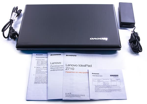 Ноутбук Lenovo IdeaPad Z710 поставляется в довольно скромной картонной коробке с ручкой, а сам комплект поставки минимален: кроме ноутбука и адаптера питания в него входит лишь краткое руководство пользователя.