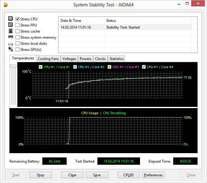 При загрузке процессора тестом Stress CPU (утилитой AIDA64 Extreme Edition — тест на стабильность системы), который использует целочисленные вычисления, частота процессора составляет 3,0 ГГц (напомним, что для процессора Intel Core i7-4700MQ максимальная частота в режиме Intel Turbo Boost составляет 3,4 ГГц). Температура процессора в этом режиме загрузки не превосходит 80 °С, что вполне допустимо.