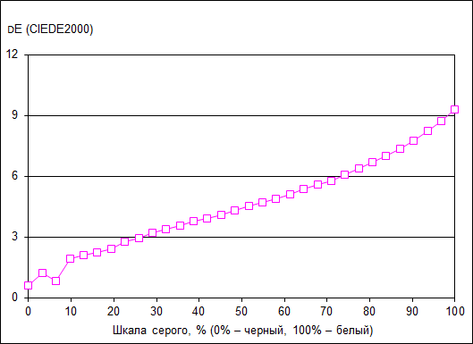 Что касается точности цветопередачи, то максимальное значение дельта Е не превосходит 10 единиц, что вполне допустимо для такого класса устройств.
