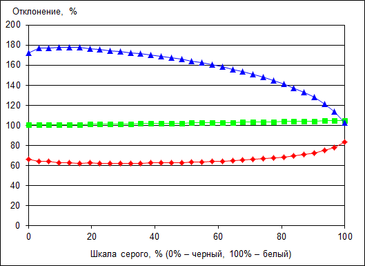 50% яркости экрана на белом фоне составляет 43,4 кд/м², а на черном фоне — 0,08 кд/м². При данной яркости контраст составляет 536:1, а значение гаммы — 2,06. Отметим, что регулировка яркости экрана в данном случае не линейная и значение в 50% вовсе не соответствует половине от максимального значения яркости.