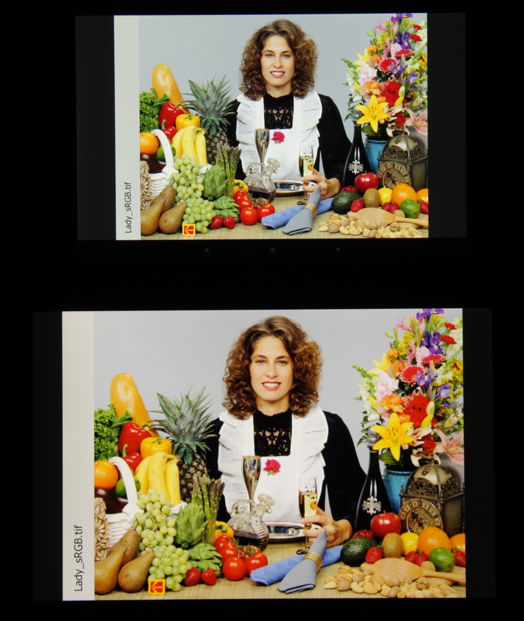 В итоге цвета изображений — рисунков, фотографий и фильмов, — ориентированных на пространство sRGB (а таких подавляющее большинство), имеют насыщенность, немного ниже естественной. Насыщенность в полутонах может быть скорректирована в программах, поддерживающих управление цветом, но блеклость насыщенных цветов все равно никуда не денется. Баланс оттенков на шкале серого хороший, так как цветовая температура близка к стандартным 6500 К и отклонение от спектра абсолютно черного тела (ΔE) меньше 10, что для потребительского устройства считается приемлемым показателем. При этом цветовая температура и ΔE не очень сильно изменяются от оттенка к оттенку, что хорошо сказывается на визуальной оценке цветового баланса. (Самые темные области шкалы серого можно не учитывать, так как там баланс цветов не имеет большого значения, да и погрешность измерений цветовых характеристик на низкой яркости большая.)