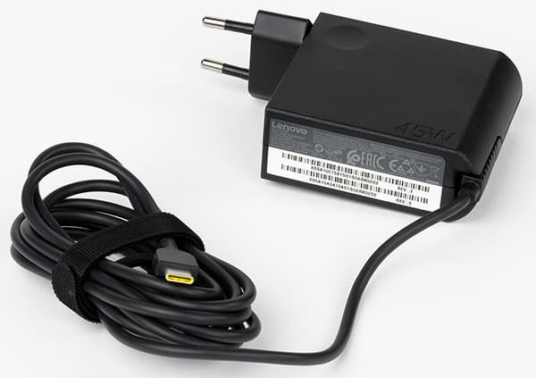 Кроме самого ноутбука в комплект поставки входит очень краткое руководство пользователя, гарантийный талон на 4 года и, конечно же, адаптер питания на 45 Вт (20 В; 2,25 А). Адаптер питания имеет разъем USB Type-С и кроме зарядки ноутбука может использоваться для зарядки других гаджетов. Кроме режима 20 В @ 2,25 А поддерживаются режимы 12 В @ 3 А и 5 В @ 2 А.