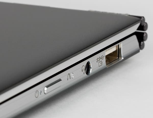 Светодиодных индикаторов состояния в этом ноутбуке всего два, и они, как и кнопка включения питания, расположены на боковых торцах корпуса, что типично для ноутбуков-трансформеров.