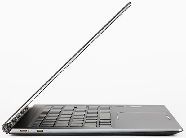Если говорить о дизайне ноутбука Lenovo Yoga 910, то здесь уместны такие эпитеты, как изящный, стильный, тонкий (толщина всего 14,3 мм) и легкий (масса ноутбука составляет всего 1,38 кг, а вместе с адаптером — чуть более 1,5 кг). Такой легкий ноутбук предназначен для того, чтобы всюду сопровождать своего владельца.